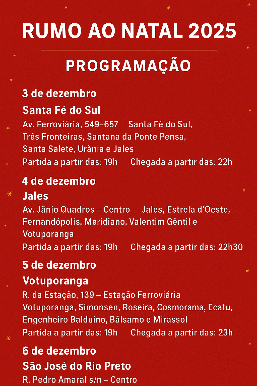 A programação oficial da Rumo ao Natal 2025, tradicional ação festiva que percorre diversas cidades do interior paulista, já está definida. O evento inicia no dia 3 de dezembro e inclui quatro noites de atividades, com passagem por mais de vinte municípios considerando somente o noroeste paulista.