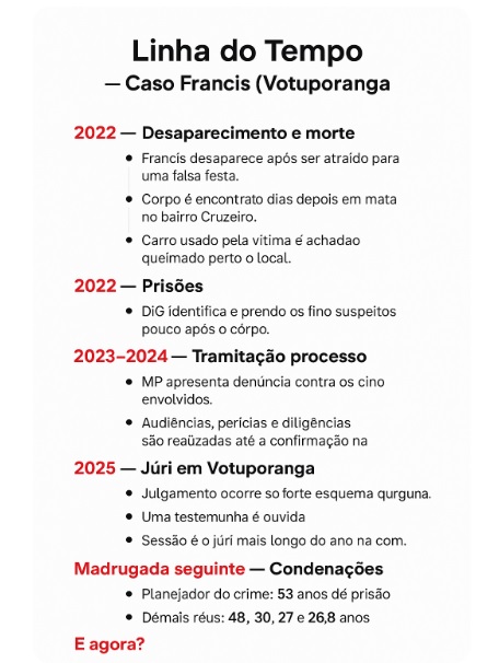 O julgamento mais longo do ano terminou na madrugada desta sexta-feira (data correta conforme publicação) com a condenação dos cinco denunciados pela morte de Francis Felipe Plácido de Jesus, ocorrida em 2022. A investigação apontou que o crime foi motivado por disputa e rivalidade entre grupos criminosos de Votuporanga.