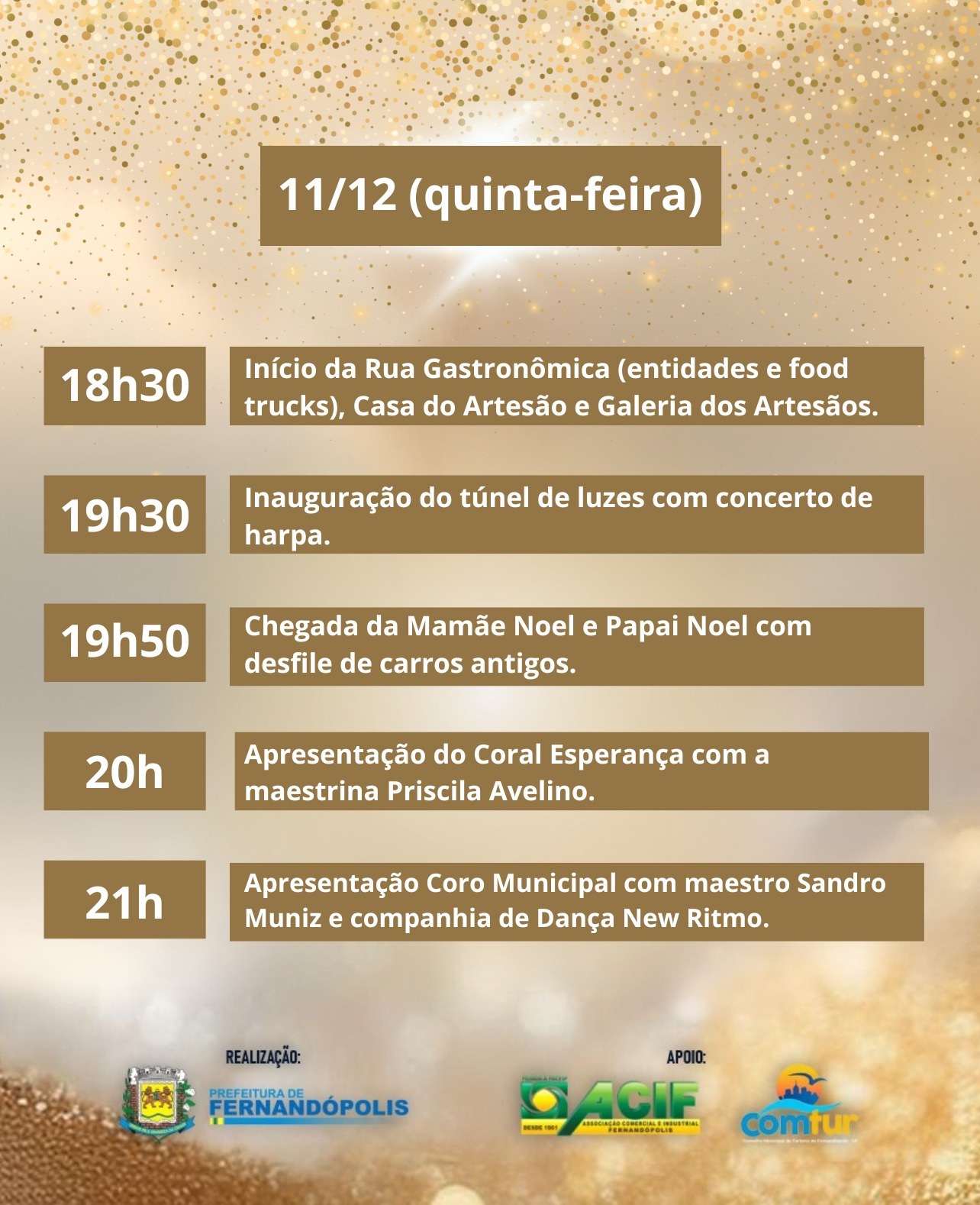 O tradicional Fernatal será aberto nesta quinta-feira (11), a partir das 18h30, com a Rua Gastronômica, que reúne barracas de entidades sociais e food trucks. O evento também contará com artesanato, apresentações culturais, presença do Papai Noel e Mamãe Noel e inauguração do túnel de luzes inédito.