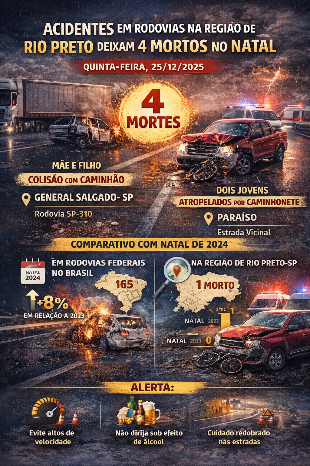 Ao menos quatro pessoas morreram em acidentes de trânsito registrados em rodovias da região de São José do Rio Preto (SP) durante o feriado de Natal, nesta quinta-feira (25 de dezembro de 2025). As ocorrências foram registradas em General Salgado e Paraíso, em trechos distintos da malha viária regional. Em um dos casos, chovia no momento do acidente.