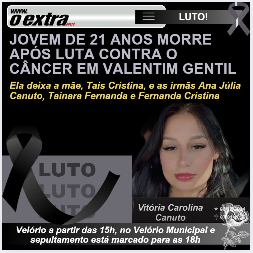 A jovem Vitória Carolina Canuto Rocha, de 21 anos, faleceu na madrugada desta quarta-feira (7), em Valentim Gentil. Nascida em 6 de dezembro de 2004, ela enfrentava um tratamento contra o câncer e não resistiu à doença.