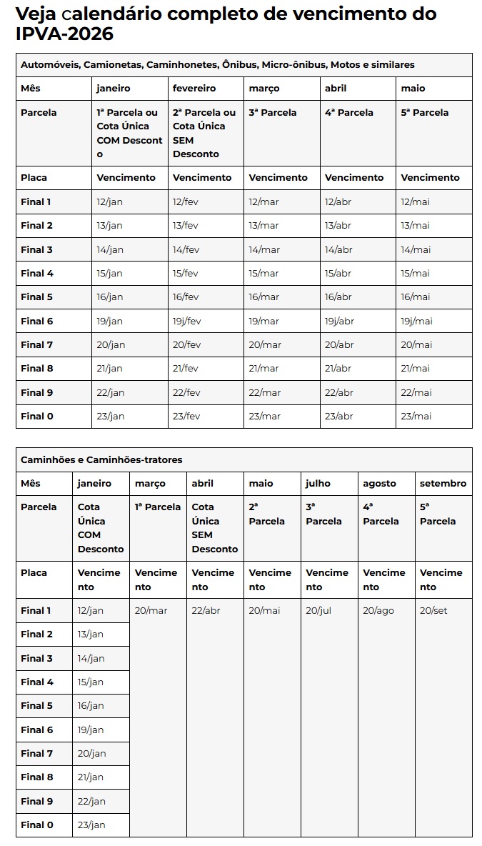 O pagamento segue o final da placa do veículo e pode ser feito à vista, com desconto de 3%, ou parcelado em até 5 vezes, de acordo com o valor do imposto devido.