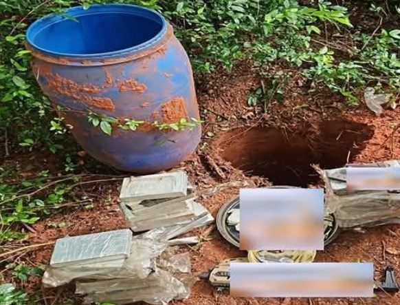 No ponto indicado, os investigadores localizaram um tambor enterrado, onde estavam escondidos os entorpecentes e outros materiais ilícitos.