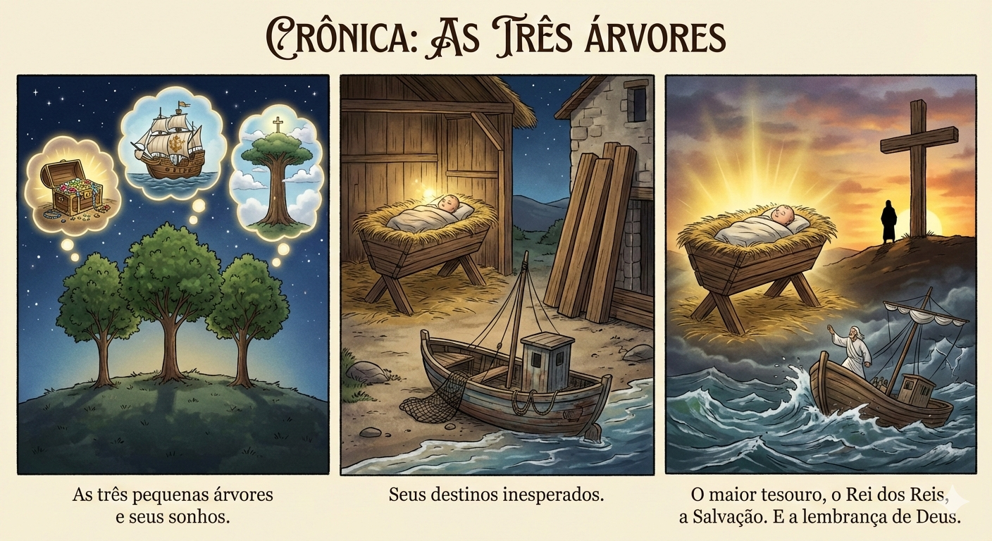 Mas, numa certa noite, cheia de luz e de estrelas, onde havia mil melodias no ar, uma jovem mulher colocou seu neném recém-nascido naquele cocho de animais. E de repente, a primeira árvore percebeu que continha o maior tesouro do mundo! A segunda árvore, anos mais tarde, estava transportando um homem que acabou dormindo no barco, mas quando a tempestade quase afundou o pequeno barco, o homem se levantou e disse: “passe”! E num relance, a segunda árvore entendeu que estava carregando o rei dos céus e da terra. Tempos mais tarde, numa sexta-feira, a terceira árvore espantou-se quando suas vigas foram unidas em forma de cruz e um homem foi pregado nela. Sentiu-se horrível e cruel. Mas logo após, no Domingo, o mundo vibrou de alegria e a terceira árvore entendeu que nela havia sido pregado um homem para salvação da humanidade e que as pessoas sempre se lembrariam de Deus e de seu filho Jesus Cristo ao olharem para ela.