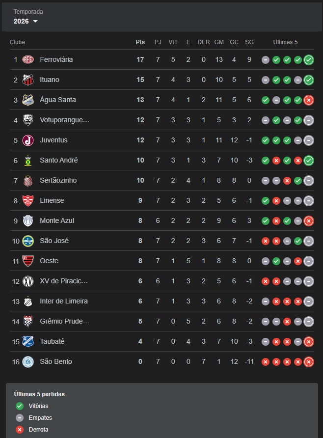 Na liderança do campeonato aparece a Ferroviária, com 17 pontos, seguida por Ituano (15) e Água Santa (13).