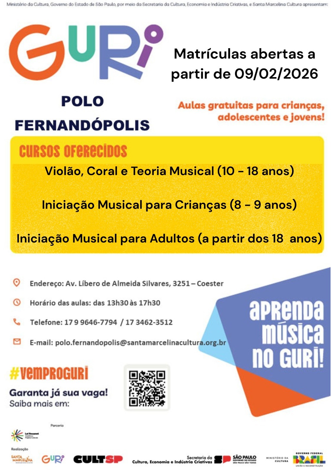 A Prefeitura informa que a partir de segunda-feira (09) estarão abertas as matrículas para os cursos gratuitos de música do Projeto Guri. As aulas são destinadas a crianças e adolescentes de 6 a 18 anos e de adultos a partir dos 18 anos.