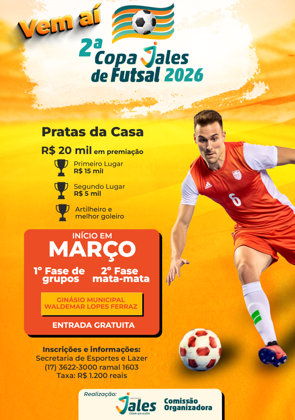 A Prefeitura de Jales, por meio da Secretaria Municipal de Esportes e Lazer, e Comissão Organizadora vão realizar mais uma grande competição esportiva no município: a 2ª Copa Jales de Futsal, que será realizada a partir do mês de março o torneio promete movimentar o cenário esportivo regional, reunindo equipes em disputas de alto nível e com premiação total de R$ 20 mil.