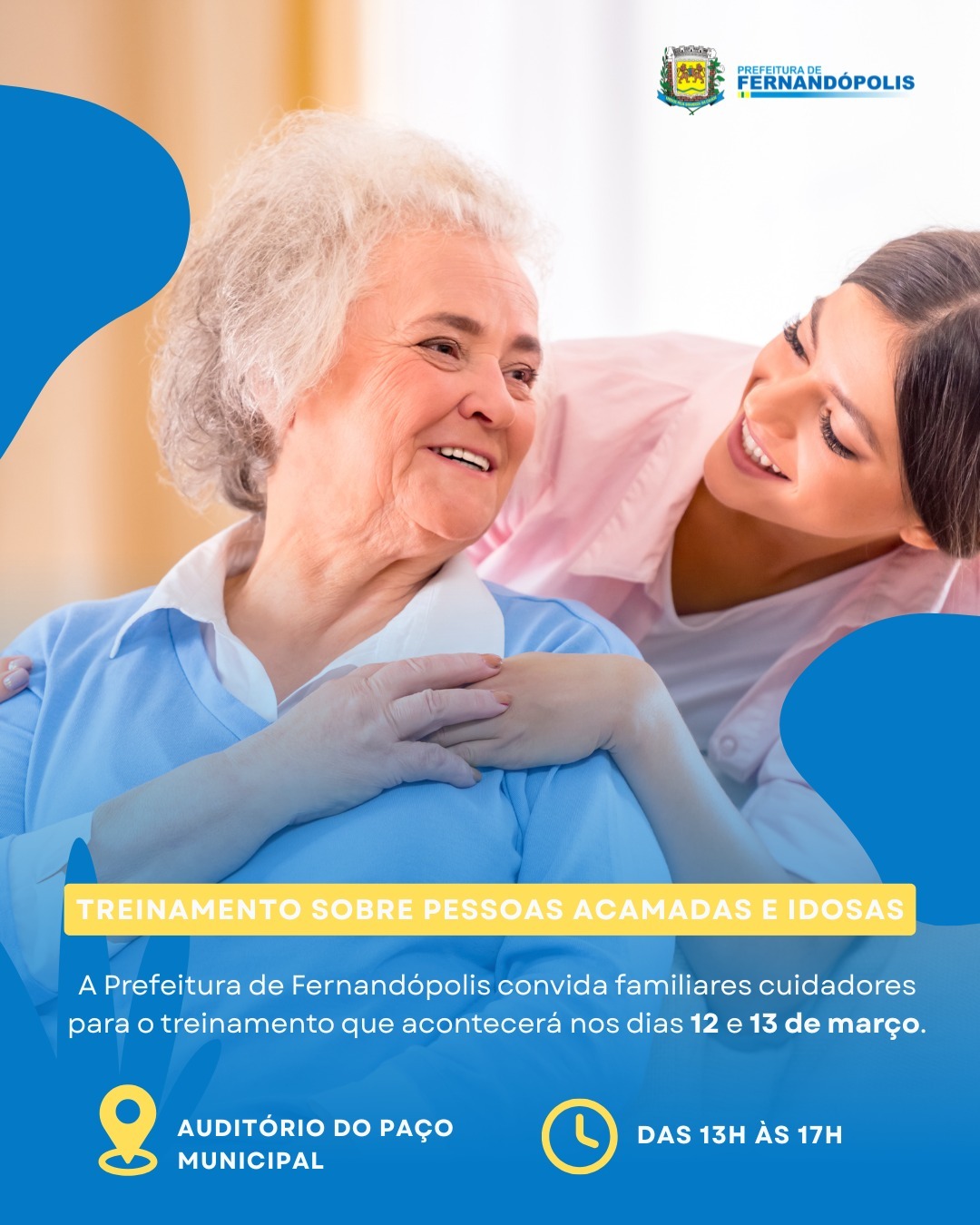 A Prefeitura de Fernandópolis, por meio da Secretaria Municipal da Saúde e dos programas Cuidado à Pessoa Idosa e Melhor em Casa, convida familiares cuidadores para um treinamento voltado ao cuidado de pessoas acamadas e idosas, nos dias 12 e 13 de março.