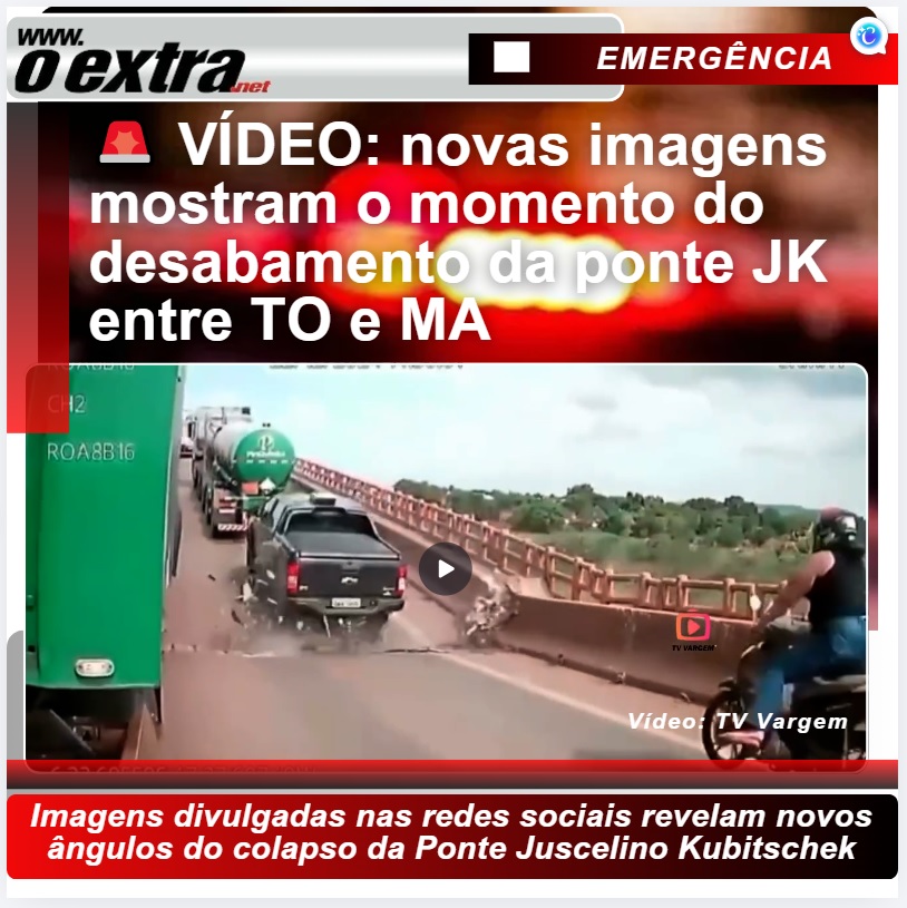 Imagens divulgadas nas redes sociais revelam novos ângulos do colapso da Ponte Juscelino Kubitschek, que ligava Tocantins ao Maranhão.