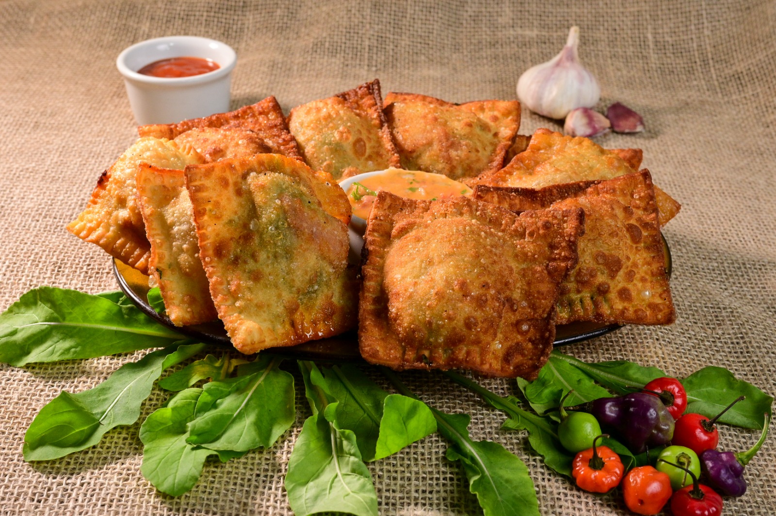 Petisco participante do desafio principal - Pastéis do Jack (Mini pastéis de costela com queijo, tomate seco e rúcula, acompanhados de geleia de pimenta e vinagrete)
