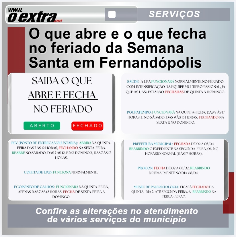 Com o feriado da Sexta-feira da Paixão nesta sexta-feira, 3 de abril, haverá alteração no atendimento de vários serviços do município de Fernandópolis.