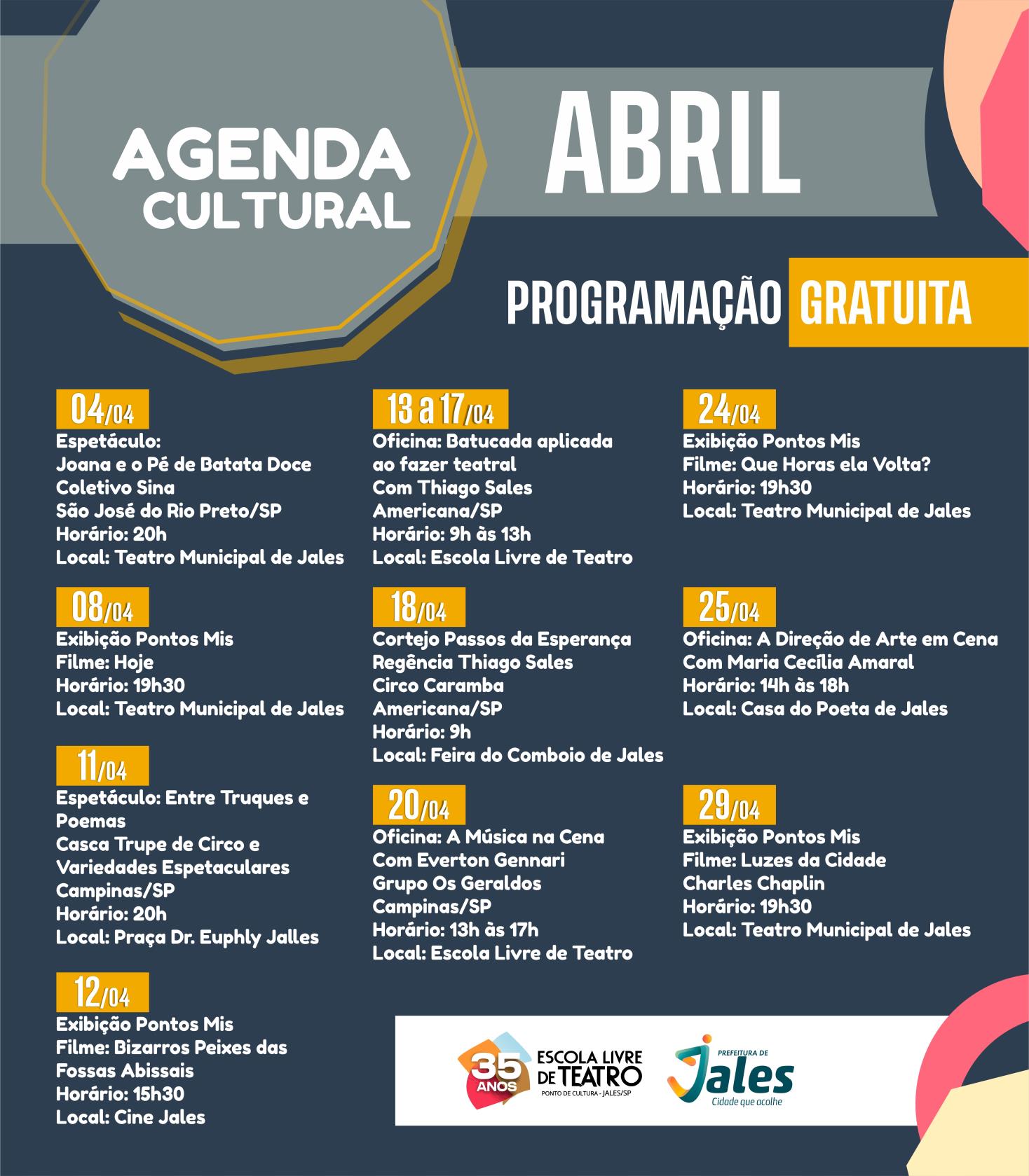 Mais do que uma agenda cultural, a programação de abril da Escola Livre de Teatro de Jales se apresenta como um convite à participação ativa da população, incentivando o acesso à arte, a formação cultural e o fortalecimento dos vínculos comunitários.