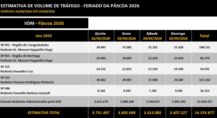O Departamento de Estradas de Rodagem (DER-SP), órgão vinculado à Secretaria de Meio Ambiente, Infraestrutura de Logística (Semil) do Estado de São Paulo, dará início na quinta-feira (2) à Operação Páscoa 2026, uma das maiores ações de suporte ao usuário realizadas pelo órgão. Até o domingo (5), mais de 14,3 milhões de veículos devem circular pelos 12,1 mil quilômetros de rodovias não concedidas sob gestão do departamento, número 20,3% superior ao registrado no mesmo feriado de 2025.