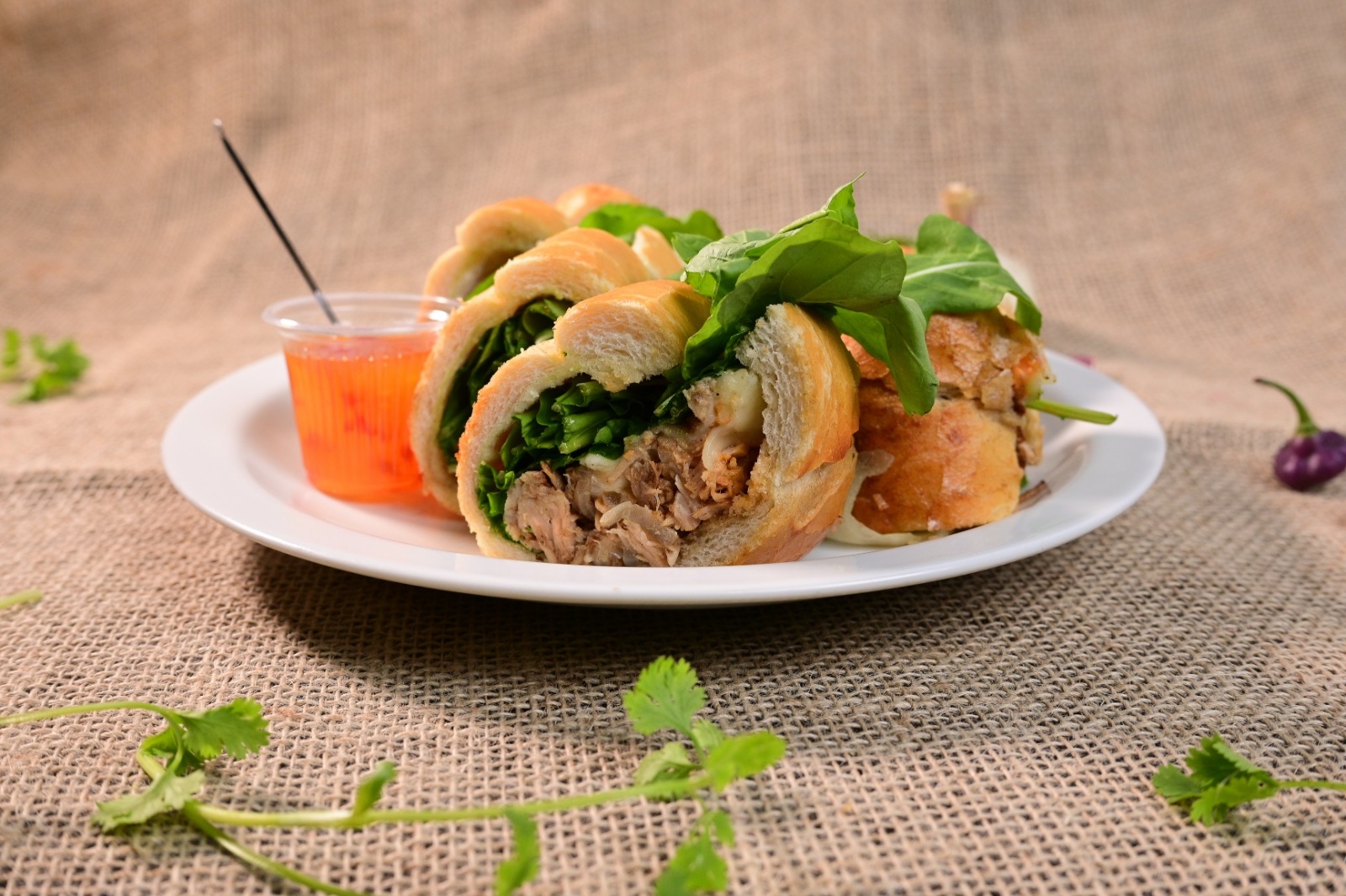 Petisco participante - Boquinha de anjo (Sanduíche no pão de baguete, com rúcula, molho vinagrete e pernil desfiado acebolado)