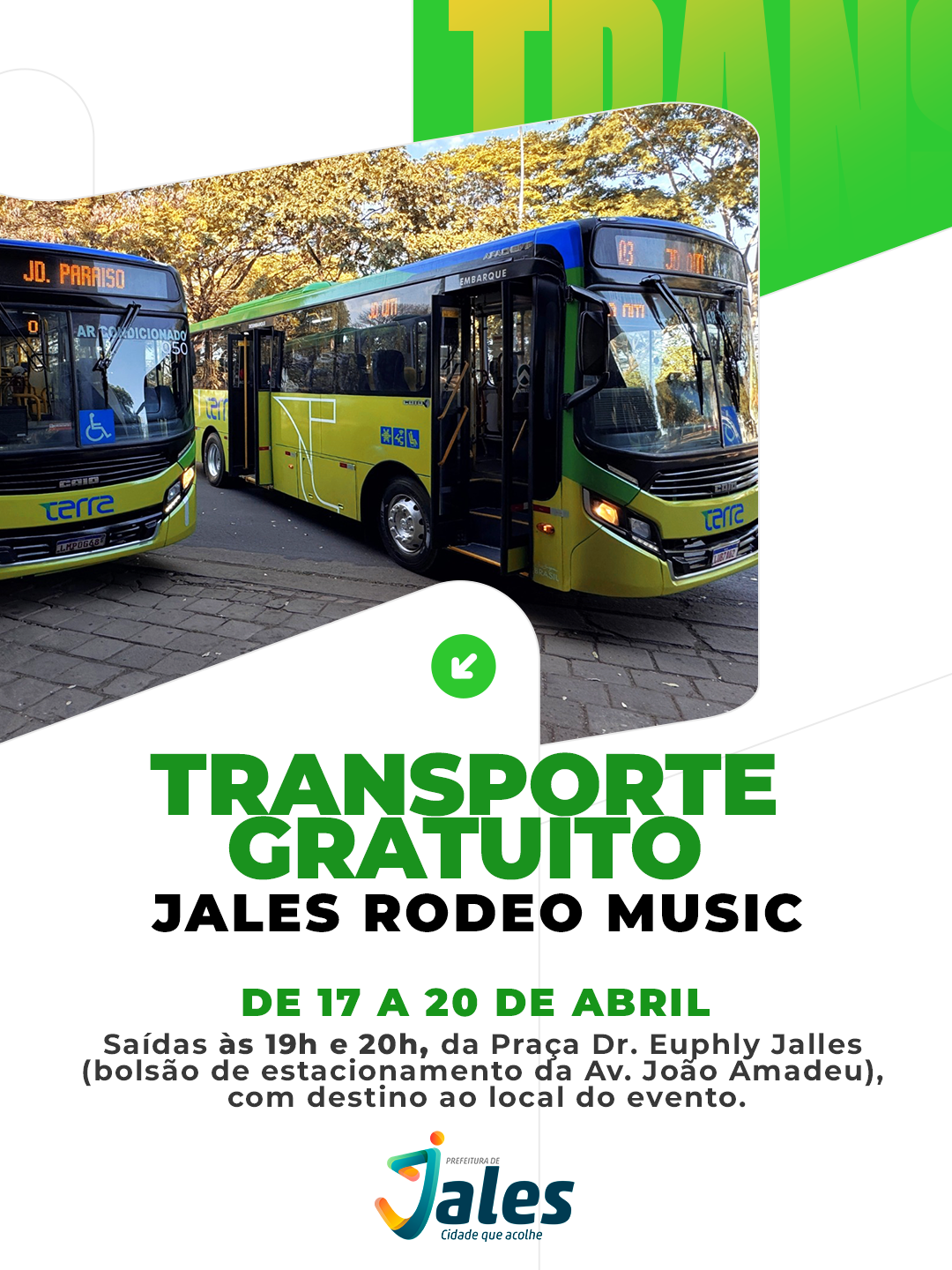 A Prefeitura de Jales, por meio da Secretaria Municipal de Mobilidade Urbana e Segurança Pública, vai disponibilizar transporte coletivo gratuito para a população durante os dias do Jales Rodeo Music, de 17 a 20 de abril, garantindo segurança, praticidade e comodidade aos munícipes que desejam participar do evento.