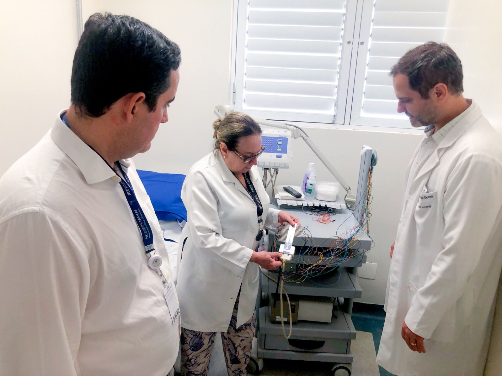 Os neurologistas Dr. Carlos Rocha, Dra. Lucia Helena e Dr. Renan Gomes avaliam máquina que contém eletrodos para o monitoramento de crises de epilepsia em pacientes. Foto: Divulgação / Fonte: Famerp