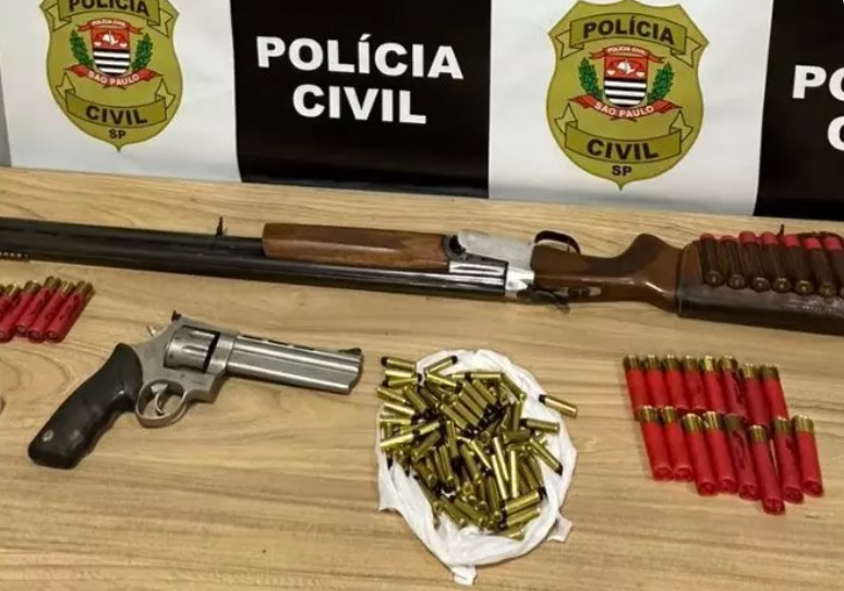 Durante o cumprimento do mandado de busca, os policiais civis localizaram um revólver calibre .357 Magnum, uma espingarda e 126 munições de diferentes calibres. O investigado possui registro como CAC (Colecionador, Atirador Desportivo e Caçador), mas não estava no imóvel no momento da diligência.