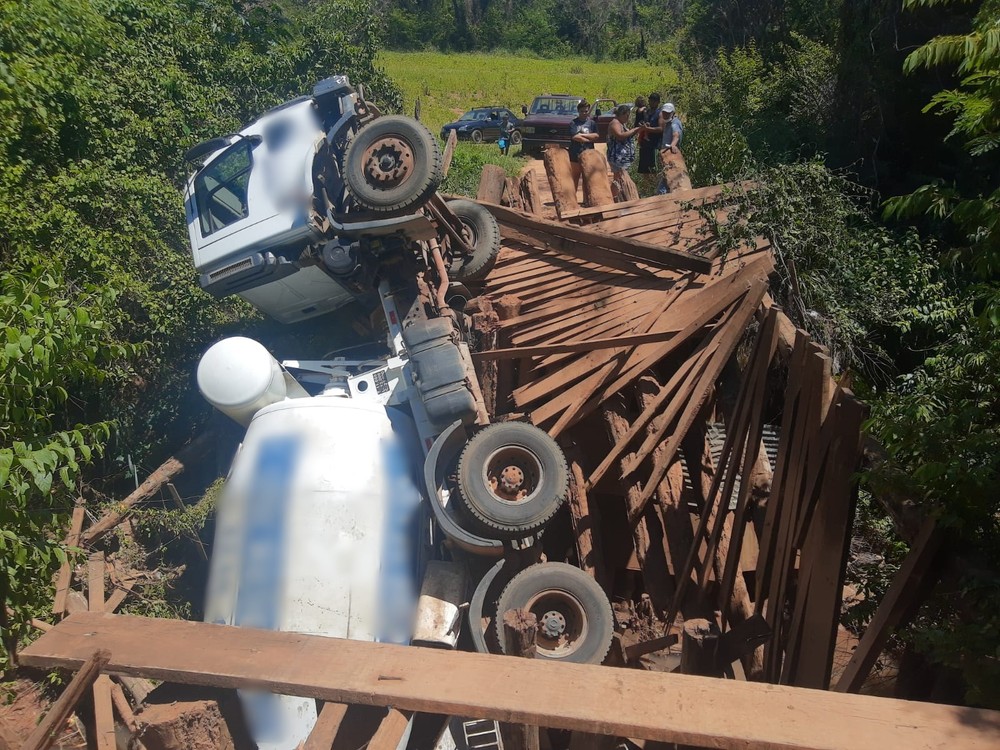 Caminhão cai em córrego após ponte de madeira ceder