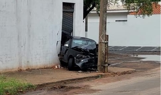 Carro fica preso entre poste e parede após acidente no Jardim Oiti
