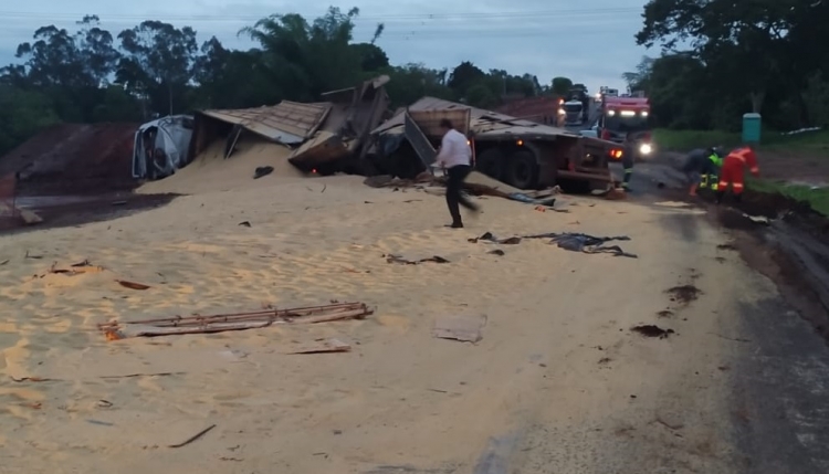 Carga do caminhão ficou espalhada pela pista que precisou ser interditada