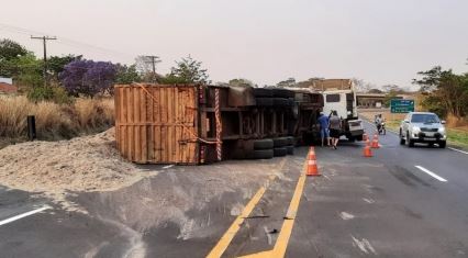 Carga de caminhão carregado com areia tomba em rodovia da região