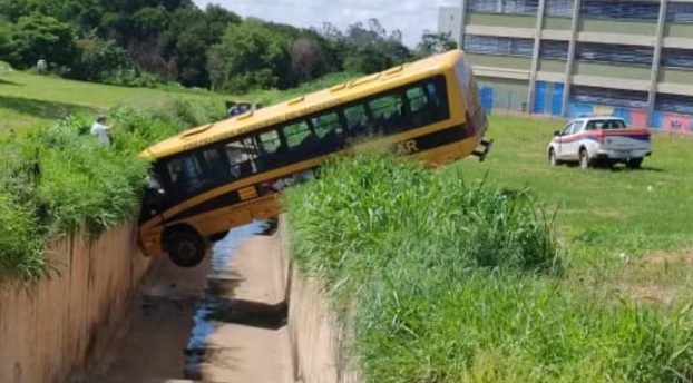 Ônibus escolar fica sem freio e cai dentro de canaleta de córrego