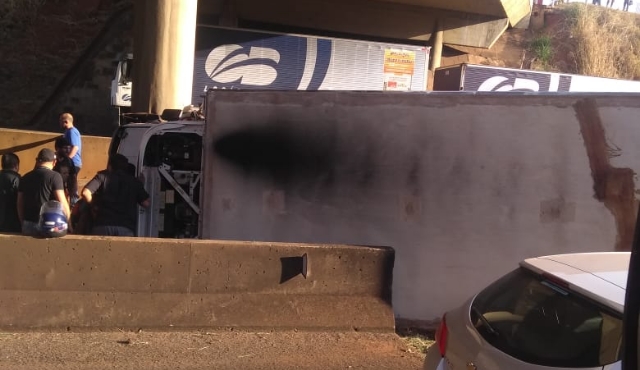 Caminhoneiro fica ferido após capotar em alça de acesso em avenida