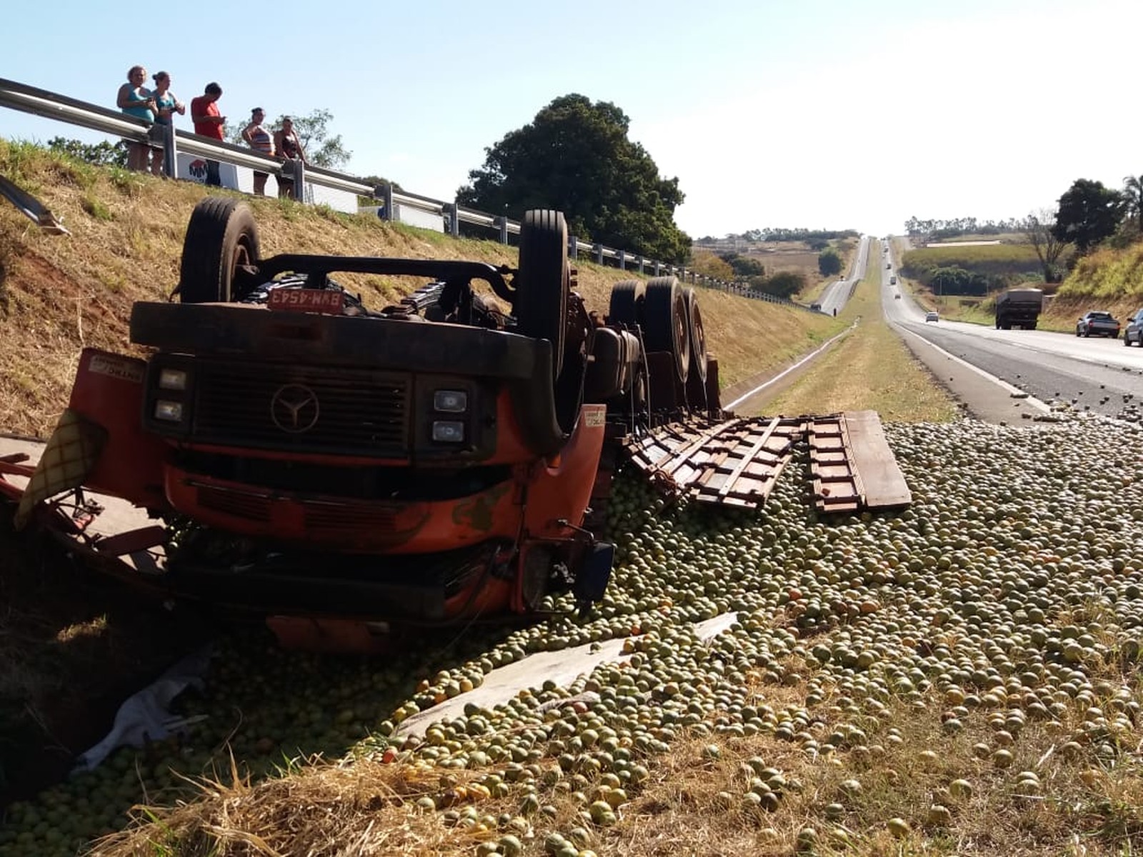 Caminhão carregado com laranja tomba em rodovia