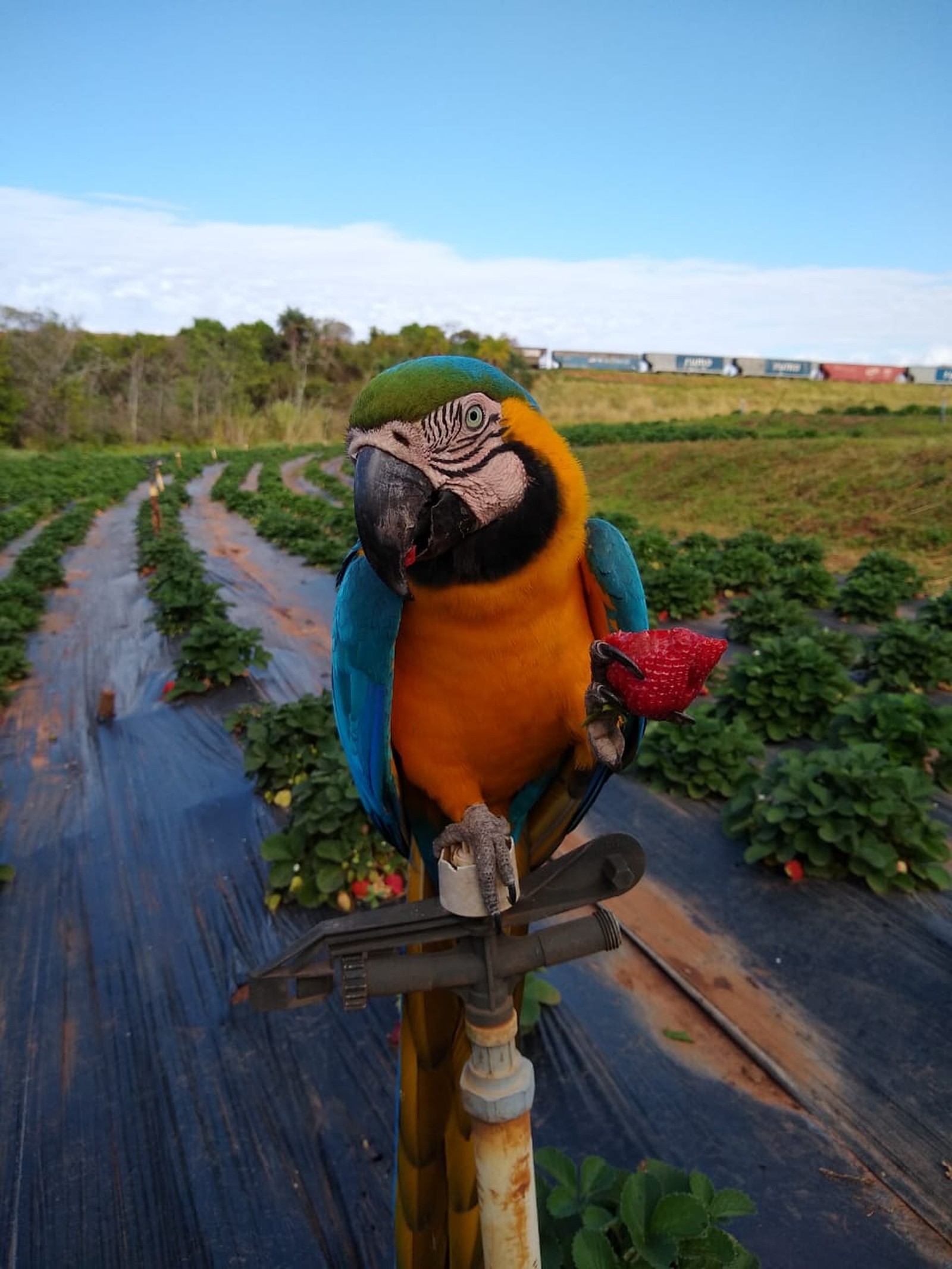 Arara surpreende agricultor ao comer morango e 'posar' para foto