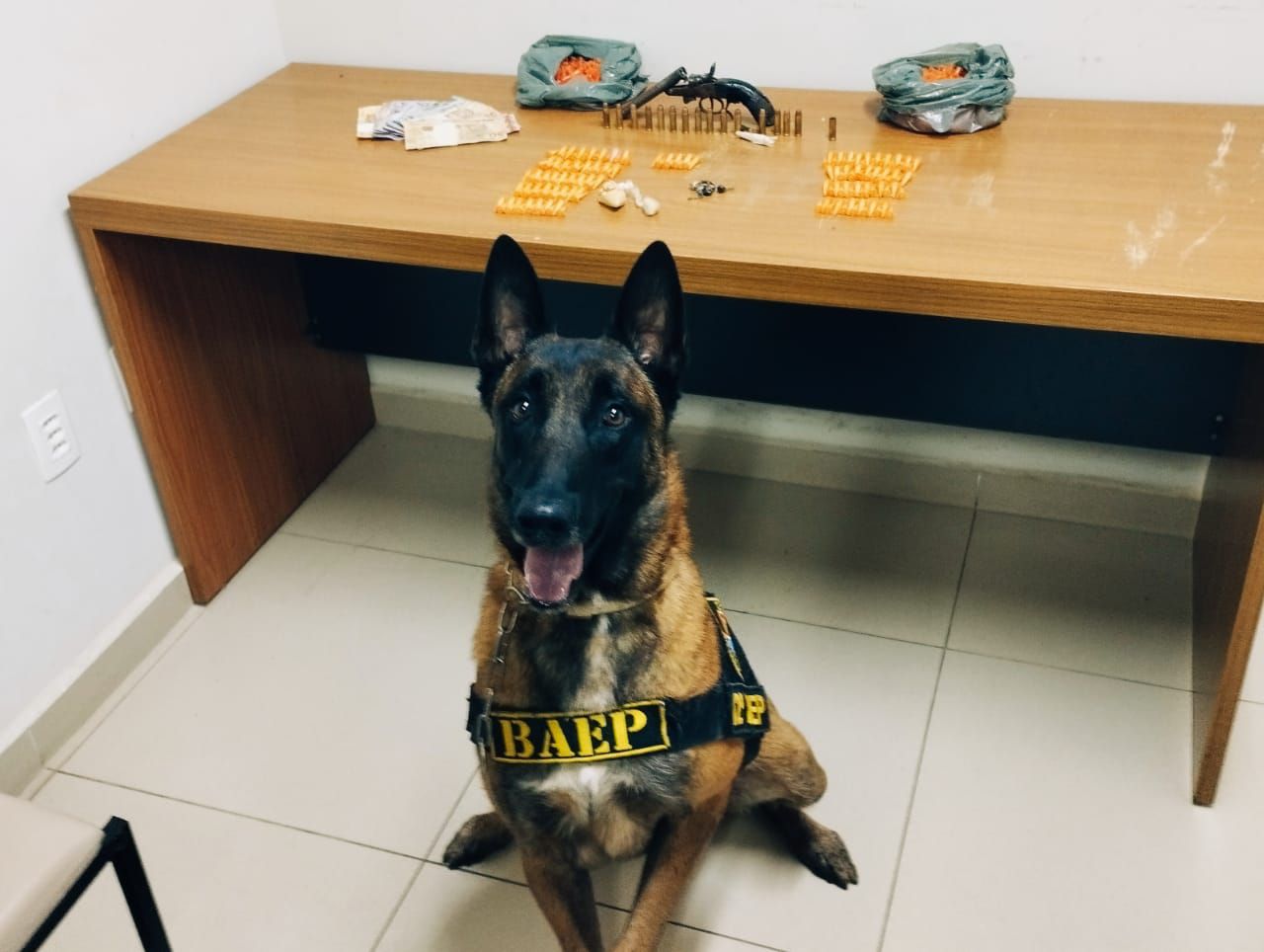 Cão farejador da PM encontra cofre com drogas e arma em casa