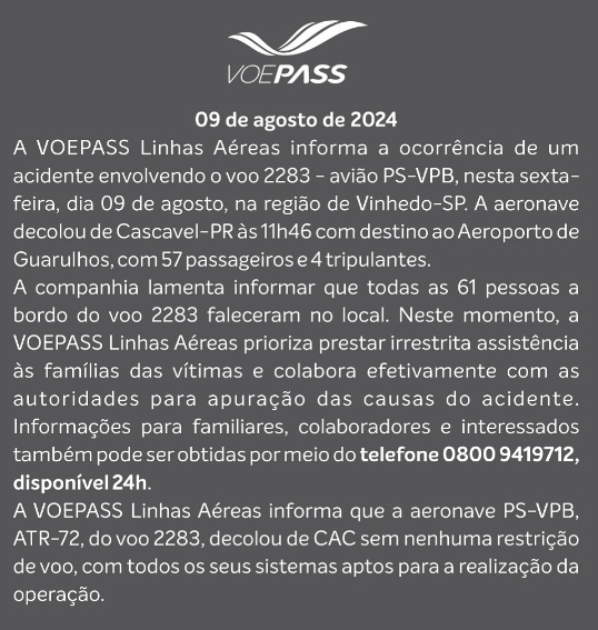 Avião que caiu em Vinhedo tinha 62 pessoas a bordo