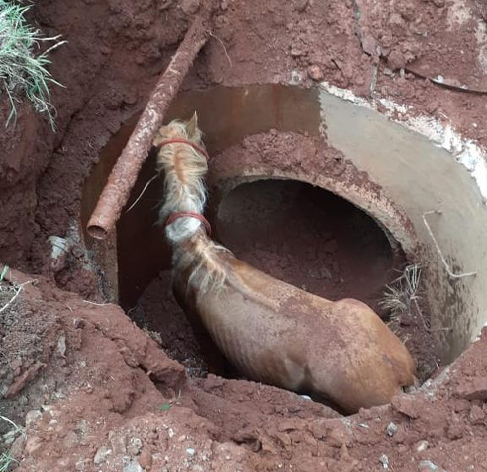 Cavalo cai em galeria pluvial e resgate mobiliza bombeiros