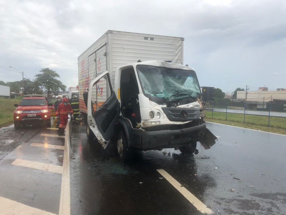 Três pessoas ficam feridas em acidente envolvendo dois caminhões