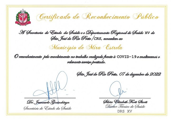 Mira Estrela recebe certificado pelo trabalho realizado frente à Covid