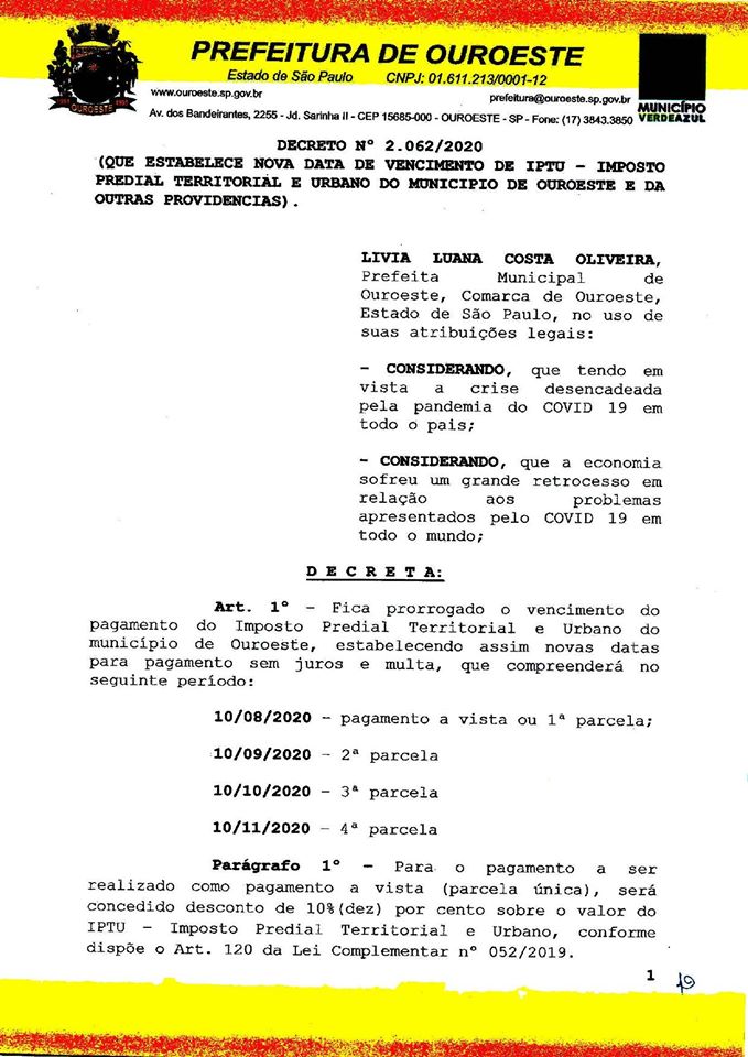Prefeitura de Ouroeste altera data de vencimento do IPTU 2020