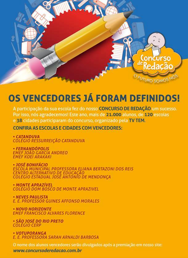 Alunos serão premiados na próxima semana, em cerimônia na cidade de São Jose do Rio Preto