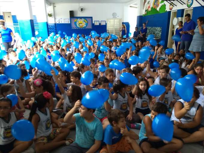 Com bexigas azuis, alunos cantaram e ouviram mensagens