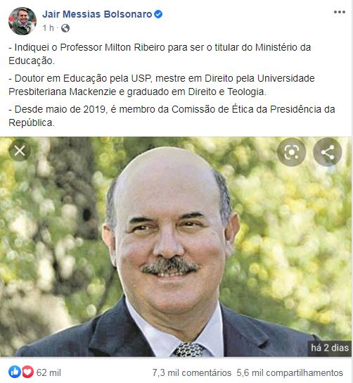 Bolsonaro anuncia Milton Ribeiro como novo ministro da Educação