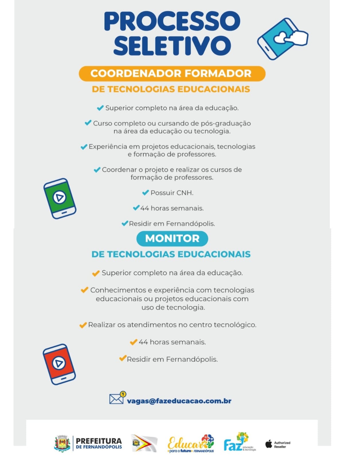 Fernandópolis abre processo seletivo para Coordenador e Monitor