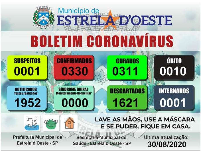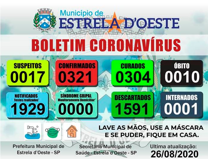 Estrela d'Oeste tem 322 casos positivos e 13 suspeitos, com 10 óbitos