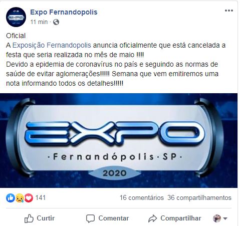 Expo Fernandópolis está oficialmente cancelada