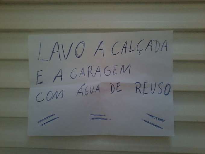 Dona de casa coloca cartaz dizendo que faz o reuso da água que usa