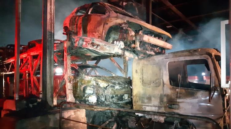 Motorista dorme, e caminhão cegonha que levava 11 Onix pega fogo