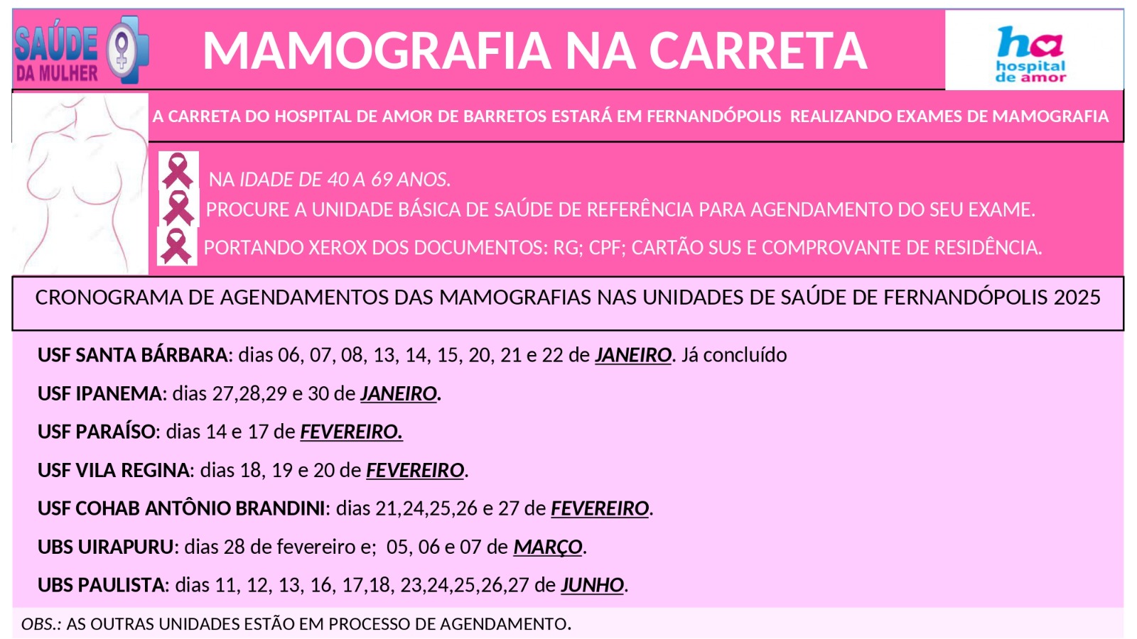 Confira a programação da Unidade Móvel do HA na cidade