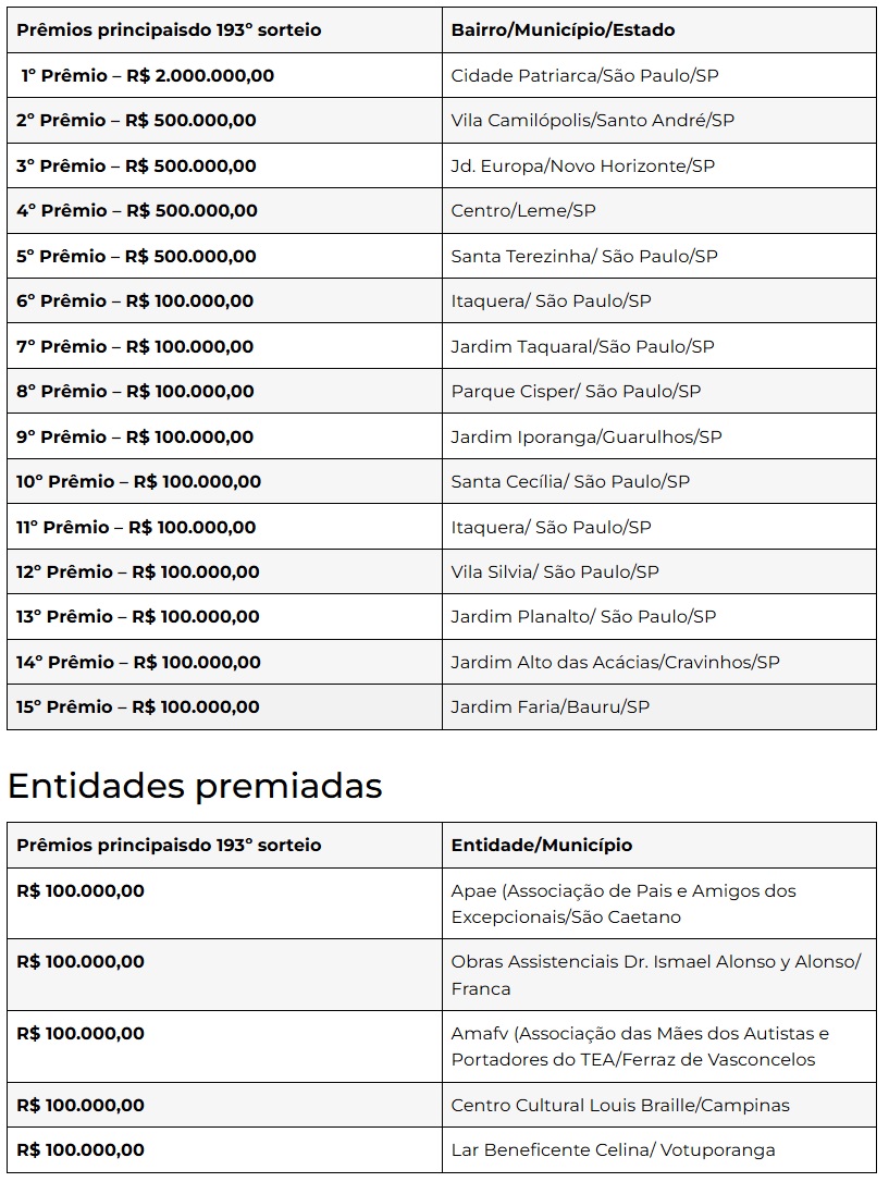 Ganhadora de R$ 1 milhão e entidade assistencial estão entre os premiados