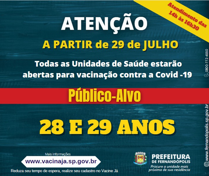 Fernandópolis inicia vacinação em público de 28 e 29 anos