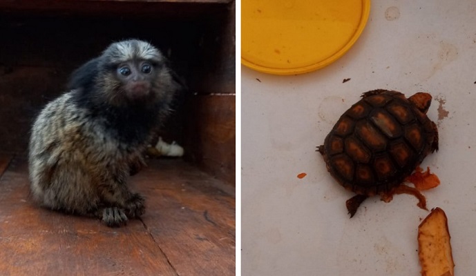 Filhotes de macaco e jabuti mantidos em cativeiro são resgatados