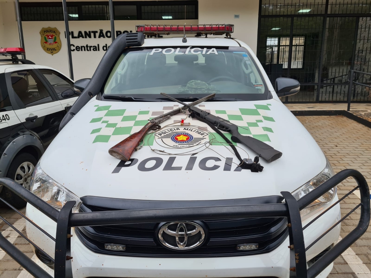 Foram apreendidas uma espingarda cal.32, três cartuchos, e uma moto