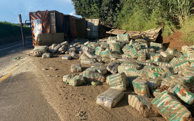 Uma carreta transportando pacotes de arroz tombou na BR-153 em José Bonifácio