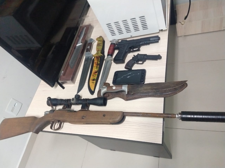 Uma espingarda calibre 22, munições, simulacros e facas foram encontradas